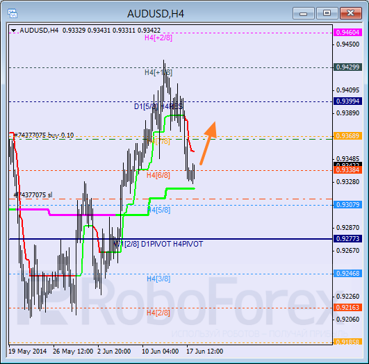 GBPJPY is probably returning to bullish scenario. Price is setting new highs, it allowed to move stops and reduce risk. Super trend lines provide support. 8/8 is considered to be a target.At H1 chart, GBPJPY level 8/8 is broken out and stays in «overbought» area. Before that, sellers were not strong enough to push price to 6/8. It’s not excluded that we will see breakout of +2/8, it may lead to forming new structure.